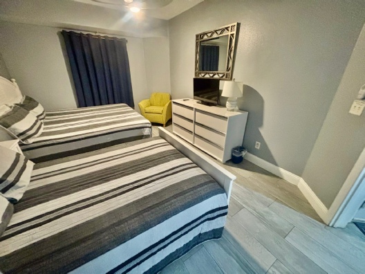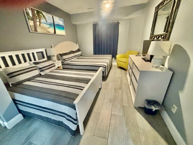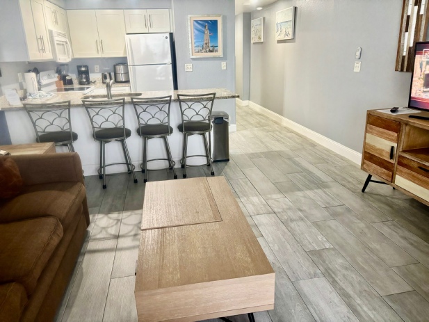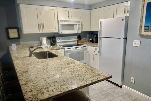 1 King 1 Full Size beds in the Bedroom, Sofa/Queen pullout in living room Sleeps 6 Beautifully remodeled kitchen, new porcelain tile and amazing full ocean front views. 1 King Bed with pull out sleeper sofa, will sleep a total of 4. Fresh and Clean and newly remodeled with granite countertops and tile floor throughout the condo. |